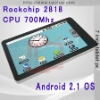Rochchip 2818 Wi-Fitablet pc androidCPURockchips2818,ARM+DSP+GPU700MHZSystemMemory256MBDDR2built-in2GBNandFlashExtendmemorysupportTFcardupto32GBOSGoogleAndroid2.1Camera30WPixelsdigitalcameraBatterybuilt-in3200mAhrechargeablelithiumbatteryRuntimeupto2hours;standby8hoursNetworkWI-FIwirelesslan802.11b/g3G(WCDMA/TDSCDMA/EVDO)optionalI/Oports2*MimiUSB1*DC-injack1*3.5mmheadphonejack1*TFcardDISPLAY7inch16:9screen800*480color262,114colours, TFTLCDwithProjectedResistiveTouchScreen fullsizetouchoperation,slidingmenuAudiosupportMP3,WMA,AC3,AAC,WAV,FLAC,APEVideo3GP,FLV,MP4PhotoJPEG,BMP,GIF,PNG,TIFFApplicationsoftwareMSN,Skype,Gmail,Googlemap,ebook,word, excel,PPT,PDF,Browser,games,ect LanguageArabic,Bulgarian,Catalan,ChineseSimple, ChineseTraditional,Czech,Danish,Dutch, English,Spanish,Finnish,French,German, Greek,Hebrew,Hindi,Hungarian,Indonesian, Italian,Japanese,Korean,Latvian,Lithuanian, Norwegian,Polish,Portuguese,Romanian,Russian, Serbian,Slovak,Slovenian,Swedish,Tagalog,Thai, Turkish,Ukrainian,Vietnamese,etc... WeightNW:394G;GW:783GSize(HeightXWidthXThicknessmm)19.4*11.7*0.7cmPackingColorbox17*8*23cmAccessories1*WallCharger;1*UserManual;1*USBcable; 1*colorbox1*touchpen